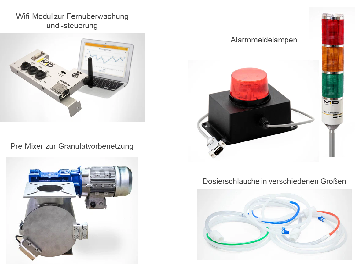 | Hauptvorteil | Schlauchpumpe schnelle Farbwechsel | Exzenterschneckenpumpe pulsationsfrei auch bei geringer Dosierung | Zahnradpumpe Farbinjektion auch in Schmelze möglich |