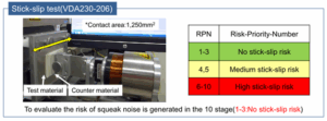Die Ermittlung von Quietsch- bzw. Knarz-Geräuschen erfolgt anhand des sogenannten Stick-Slip-Tests nach VDA 230-206. Die Knarz-Geräusche zwischen den Reibpartnern werden nach Anbringen von definierter Kraft und Reibgeschwindigkeit aufgezeichnet und als Ergebnis wird die Risk-Priority-Nummer (RPN) von 1 bis 10 (siehe Abbildung 1) bestimmt.