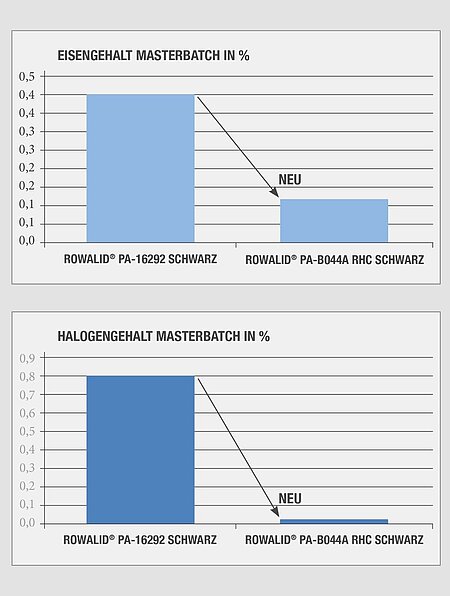 Ab sofort hat der Masterbatch-Experte eine Weiterentwicklung im Portfolio: Das Nigrosin-Masterbatch ROWALID® PA-B044A RHC SCHWARZ (RHC steht für reduced halogen content), das mit einer im Vergleich noch geringeren Elektrokorrosion und reduzierter Wechselwirkung mit anderen Rezepturbestandteilen überzeugt. Zudem ist eine Verbesserung der mechanischen Eigenschaften nach thermischer Alterung gelungen.