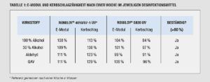 Sowohl ROMILOY® 4010/07-1 UV als auch ROMILOY® 5820 UV weisen nach einer Woche im jeweiligen Desinfektionsmittel noch mehr als 80 % vom ursprünglichen E-Modul bzw. Kerbschlagzähigkeit auf und sind damit beständig.