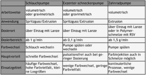 In einem Erstgespräch werden die Einsatzmöglichkeiten zur Flüssigeinfärbung eruiert und das passende ROWAMETRIC-Dosiersystem erörtert: Je nach Anwendung und Farbgebung kommen verschiedene Pumpen in Frage. So ist bei kleinen Losgrößen und vielen Farbwechseln die Schlauch- bzw. Peristaltikpumpe das ideale Dosiergerät. Bei „Dauerläufern“ oder sehr geringen Dosierungen kann wiederum die Exzenterschneckenpumpe die beste Lösung darstellen. Und soll die Farbe unter hohem Druck in die Schmelze injiziert werden, sollte die Zahnradpumpe zum Einsatz kommen.